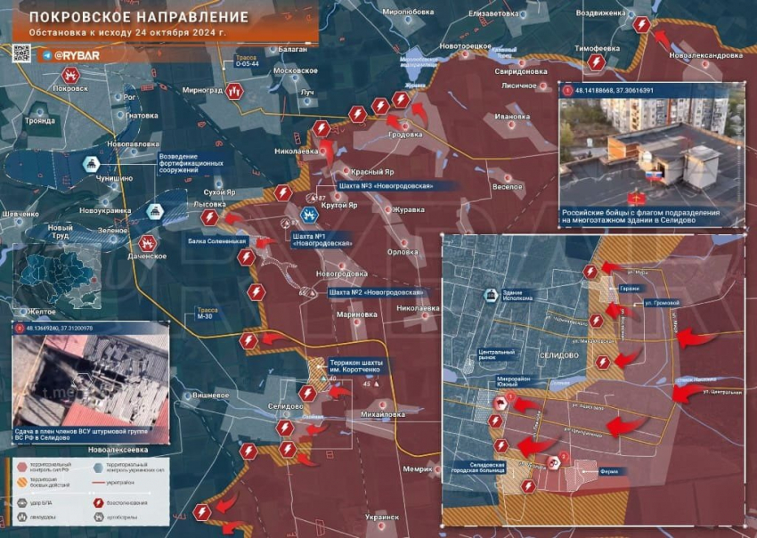 На Покровском направлении российские войска продвигаются в границах Селидово, все глубже вклиниваясь в оборону ВСУ в городе, сообщает Telegram-канал "Рыбарь".