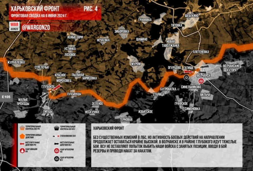 На Харьковском фронте без существенных изменений в ЛБС, но активность боевых действий на направлении продолжает оставаться крайне высокой. В Волчанске и в районе Глубокого идут тяжелые бои. ВСУ не оставляют попыток выбить наши войска с занятых позиции, вводя в бой резервы и проводя накат за накатом.