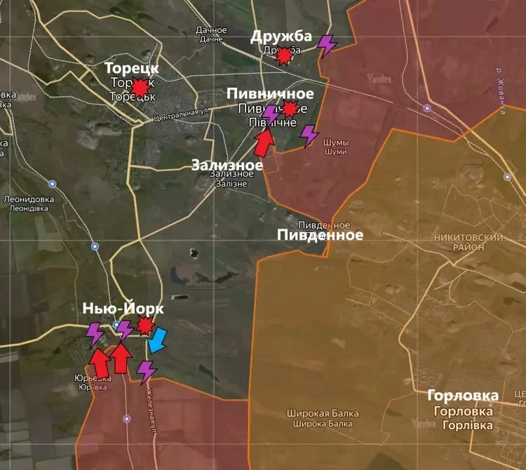 Успешное продвижение российских войск фиксируется на Торецком и Покровском направлениях. В частности, армия России смогла продвинуться в центральной части Нью-Йорка, взяв под контроль три улицы. В свою очередь на Покровском направлении с боями продвижение имеет место восточнее Лозоватского, на окраинах Новосёловки Первой и в Евгеновке.