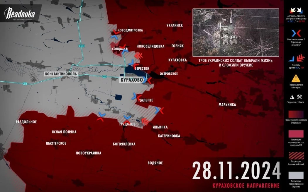 По данным Telegram-канала Readovka, при обороне на Кураховском направлении ВСУ, пропустив несколько ударов подряд, делали большую ставку на укреп в селе Сонцовка. Наконец, и оттуда их окончательно выбили, что еще четче обозначило грядущий конец всей линии обороны.