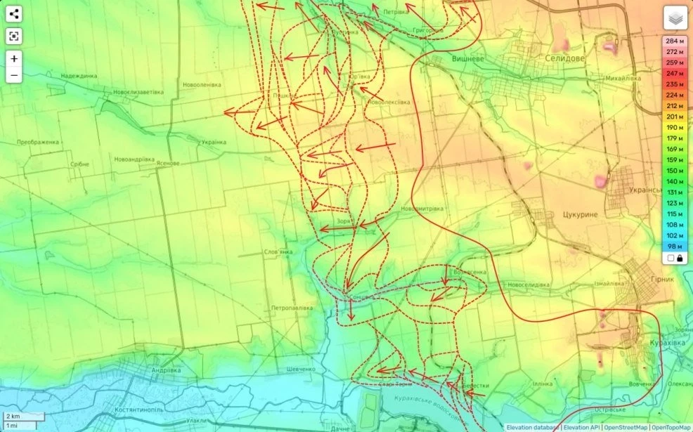 Наши штурмовые части продолжают пытаться овладеть н.п. Новопустынка. Также мы пытамеся пройти севернее н.п. Жёлтое по жд путям. Цель - н.п. Шевченко. Если ным удастся его взять под контроль, он может послужить отличной базой для дальнейшего обхода Покровска с запада.