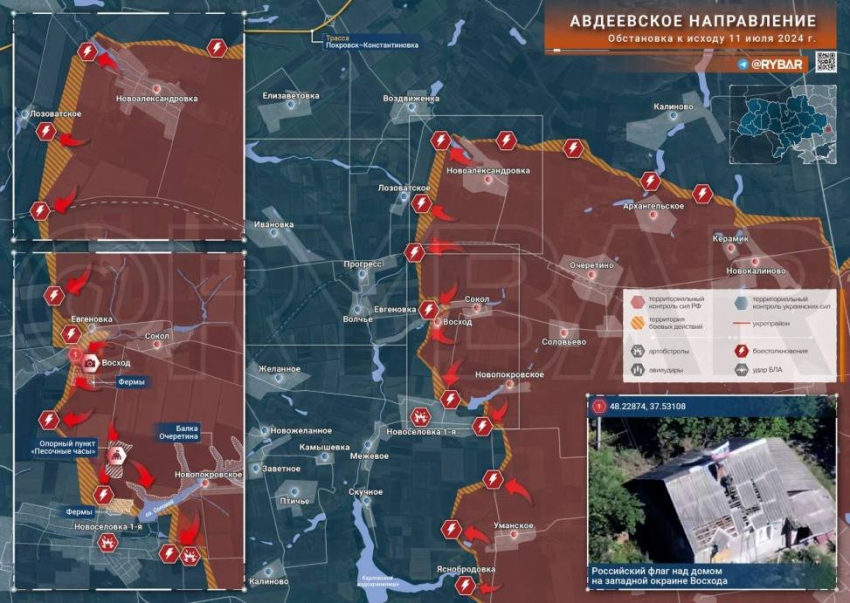 На Авдеевском направлении бойцы ВС РФ водрузили флаг на западных окраинах Восхода, подтвердив полное освобождение села. Параллельно идет закрепление российских подразделений на северных окраинах Новоселовки Первой.