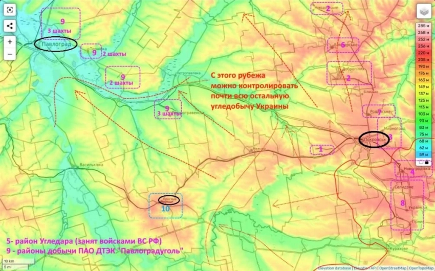 Кроме того, для прекращения добычи на шахтах объединения «Павлоградуголь» ВС РФ достаточно будет продвинуться на 40-70 километров к рубежу, обозначенному на карте. Сам Павлоград, расположенный за Покровском в Днепропетровской области, брать не обязательно. Это приведет к полному прекращению поставок угля для металлургии и теплоэлектростанций Украины, при этом закупать и завозить, с помощью судов, недостающий уголь у запада будет крайне не выгодно для Киева.