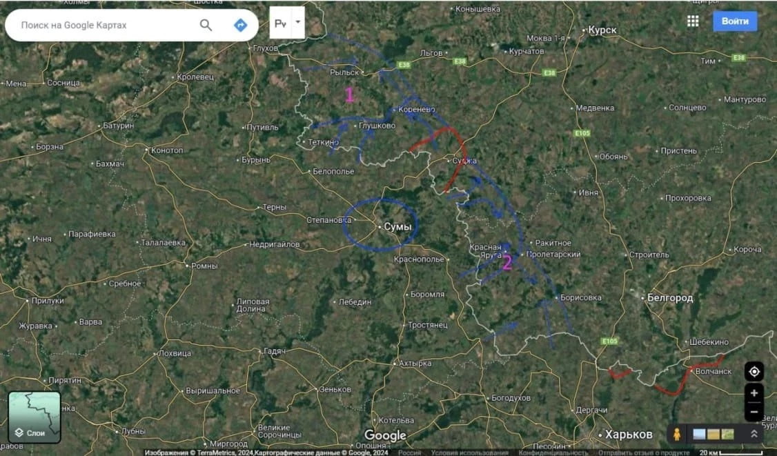 По мнению эксперта, в каждом из вариантов наступления есть и логическое его продолжение. В случае с северным - удар по Рыльску (на карте обозначено как 1) и в случае южного (обозначено как 2) - удар в тыл группировки «Север», которая сейчас ведет бои на границе Харьковской области.