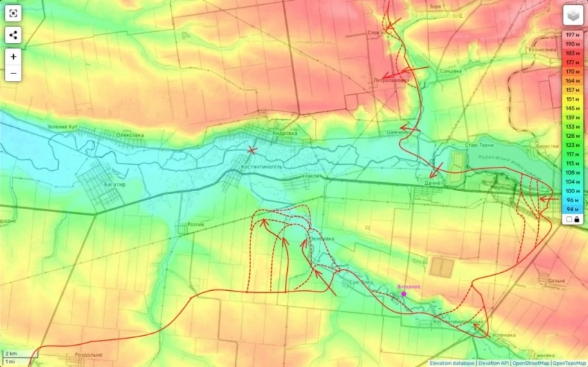 - Между Зеленовкой и Улуклы, где наши части пытаются перерезать физически последнюю дорогу из Запорожья с юга.