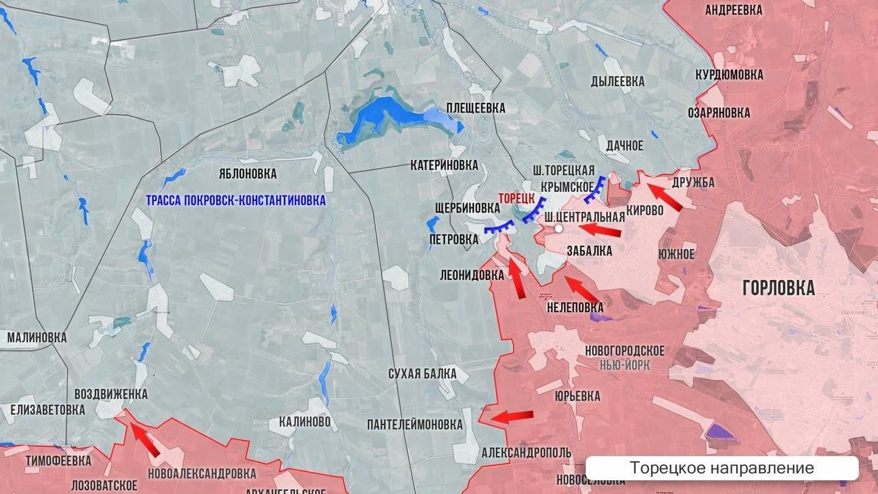 В восточной части Покровского фронта ВС РФ расширили зону контроля на северном берегу р.Казённый Торец, зачистив карман между Воздвиженкой и Тимофеевкой, и продвигается к трассе на Покровск. В Сухом Яре за ВСУ остаётся только северо-западная часть. При этом гарнизон ВСУ в соседней Лысовке, где бои идут ближе к центру, рискует оказаться в оперативном окружении. ВС РФ подошли и с запада, со стороны Даченского, контроль над которым позволит полностью перекрыть снабжение ВСУ в этом селе. Не стихают бои в направлении Чунишино вдоль ж/д. В Зелёном ВС РФ закрепились как на западной, так и на восточной окраине села. На западе фронта наши штурмовики вышли от Песчаного к Зверево: начался штурм этого пригорода Покровска. А передовые позиции российских войск сейчас примерно в 1 км от Котлино и проходящей там дороги к Покровску. Из района Солёного и Нововасильевки ВС РФ обходят с севера Успеновку и Новоалександровку, а пройдя по посадкам и балкам, давят на эти сёла с юга. Ниже по фронту наши атакуют с севера на Надеждинку, сражаются за Ясеневое, зачищают Славянку и ведут бои в Петропавловке. Контроль над этими сёлами открывает выход по балке Ставковая к рокадной дороге, которая идет от Андреевки на Покровск. А дальше по полям остается 7 км до Днепропетровской обл. Наши на 600 м приблизились к Андреевке, а также зашли в большой опорный пункт на подступах к ней.