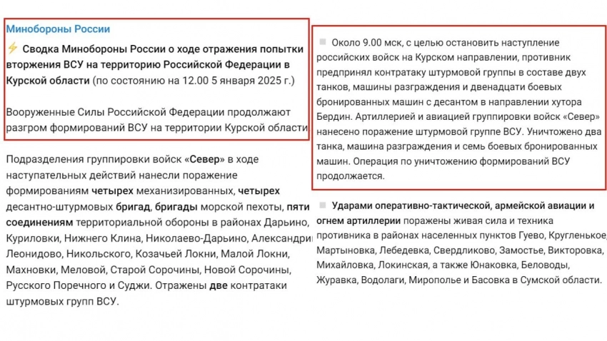 Курское направление на 05.01.25: официальное сообщение МО РФ