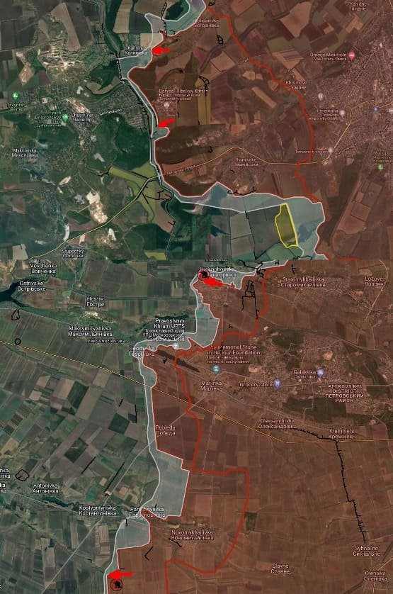 На Покровском направлении ВС РФ давят от Новоалександровки в направлении Воздвиженки, удалось закрепиться на восточной окраине села. Продолжаются позиционные бои в районе Лозоватского. Восточнее Прогресса ВС РФ продвинулись вдоль железной дороги и посадки на участке шириной до 1,12 км. В Евгеновке российские войска продвинулись в восточной части населенного пункта до 1 км. ВС РФ давят в северной и восточной частях Новосёловки Первой. Южнее российские войска имеют тактические успехи, закрепились вдоль лесополосы на участке шириной до 1.91 км. Восточнее Карловки продолжаются позиционные боевые действия.
