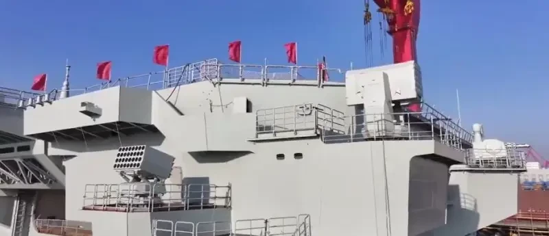 Корма с ЗРК «Тип 076» с HQ-10 (слева и справа) и ЗАК «Тип 1130» (посередине)