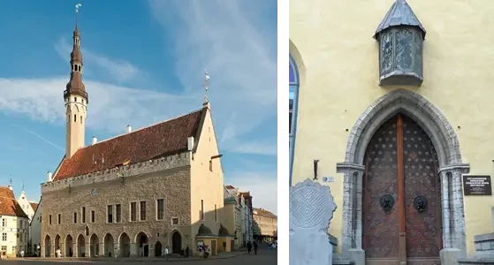 Удобно расположенный на очень важном месте торговый порт между Новгородом и Скандинавией, Таллин, тогда более известный как Ревель, превратился в один из важнейших промежуточных портов Ганзейского торгового пути между Европой и Русью, а XV век стал для Таллина временем наибольшего культурного и торгового расцвета. Главным товаром, который попадал из Европы через Таллин в Россию, была соль, за которой следовали ткани, сельдь, металлы, вино и специи. Таллин, имея промежуточное положение, получил право контролировать восточную торговлю, имея так называемое право складирования. Средневековый старый город эстонской столицы исключительно хорошо сохранился, что стало достаточной причиной для включения его в список городов Всемирного наследия ЮНЕСКО как центр ганзейского города. На фото слева: таллинская ратуша. Впервые была упомянута в 1322 году как место для собраний купцов. На фото справа: старинная дверь здания купеческой гильдии.