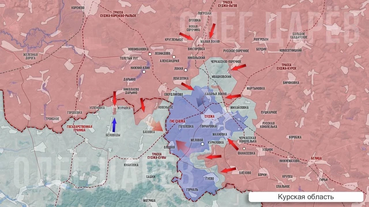 Также с мест сообщают о том, что взят под контроль посёлок Локня южнее, наши части зашли в Богдановку рядом с Казачьей Локней. ВСУ массово отходят и даже бегут с территории севернее Малой Локни и вплоть до Казачьей Локни, куда стекаются остатки северного гарнизона ВСУ, однако сейчас этот село отрезано от Суджи подорванными мостами через реку Локня, так что долго удерживать его будет для ВСУ проблематично, информирует Олег Царёв в своём Telegram-канале.