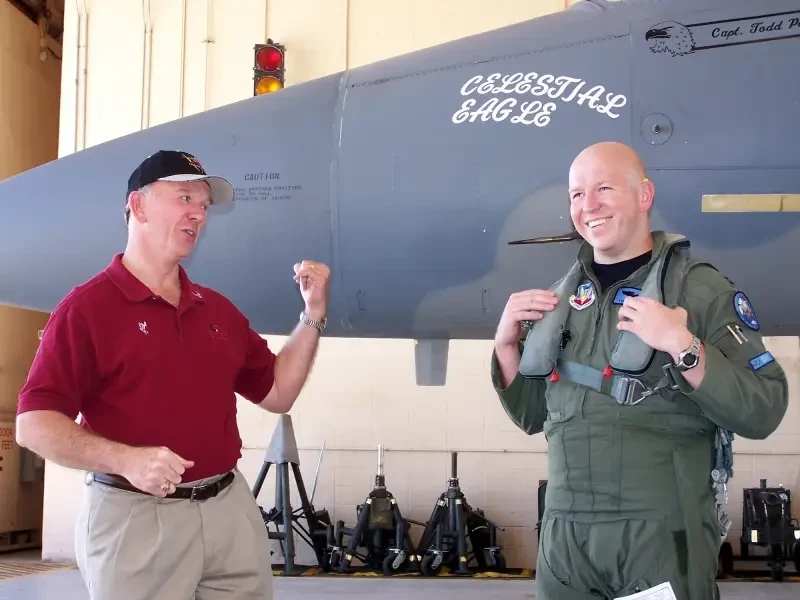 Отставной генерал-майор Дуг Пирсон (слева) и его сын капитан Тодд Пирсон (справа), пилот 390-й истребительной эскадрильи с авиабазы Маунтин-Хоум, штат Айдахо, посещают перед вылетом капитана Пирсона в памятный полет «Небесный орел» 13 сентября 2007 года на авиабазе резерва Хоумстед. Генерал Пирсон летал на точно таком же F-15 ровно 22 года назад, совершив единственное в истории успешное уничтожение спутника ракетой, запущенной с самолета. На момент фото самолет был приписан к 125-му истребительному крылу Национальной гвардии Флориды.