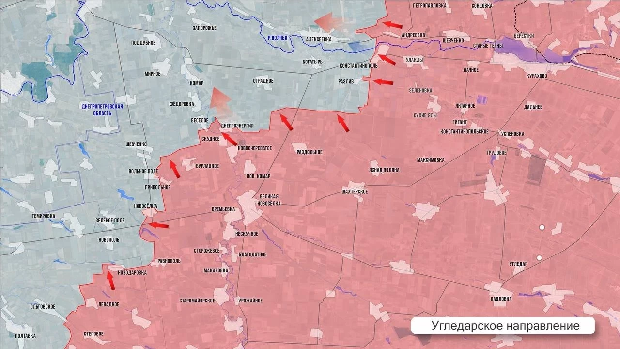 На Угледарском фронте продолжаются бои за Вольное Поле и лесополосы восточнее Шевченко. ВС РФ броском форсировали реку Мокрые Ялы и зашли на восточные окраины Весёлого, идут ожесточенные бои. Наши ведут мощную артподготовку к штурму Отрадного, до которого 4 км. Контроль над этим селом создаст условия для оперативного окружения ВСУ в Разливе, Богатыре, Алексеевке.