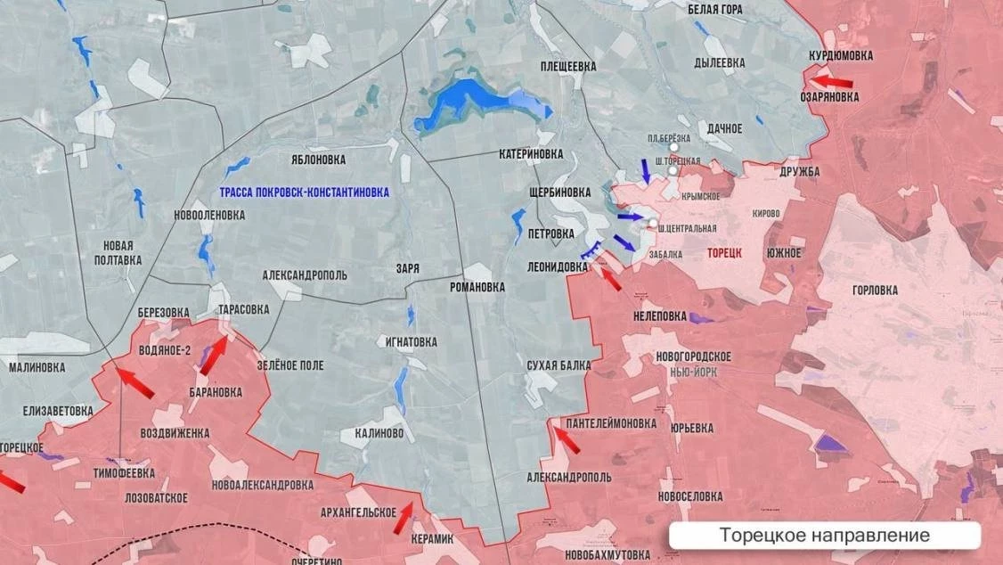 На западном фланге Торецкого участка освобождена Пантелеймоновка. Вероятнее всего, дальше наши будут наступать к Валентиновке и далее к Сухой Балке. Выдвинув фланги из района Тарасовки, наши будут стягивать образованный здесь «мешок», вынуждая ВСУ откатываться к Константиновке. В самом Торецке идут бои, ВСУ постоянно тянут резервы. Наши чуть продвинулись на фланге города со стороны Нелеповки. Из Катериновки, что северо-западнее Торецка, ВСУ бьют кассетными боеприпасами по жилым кварталам Горловки – ранено пять человек.
