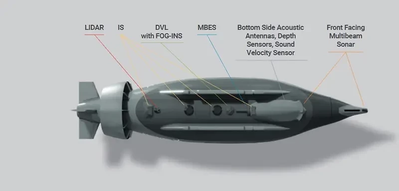 В текущей конфигурации аппарат способен исследовать морское дно и объекты ниже себя. Для этого на днище установлены ГАС высокого разрешения, оптико-электронные станции с подсветкой и лидары. В перспективе состав этого оборудования может быть пересмотрен. Кроме того, дополнительные приборные отсеки имеются на бортах корпуса. Сейчас их предлагается использовать для размещения магнитометров.