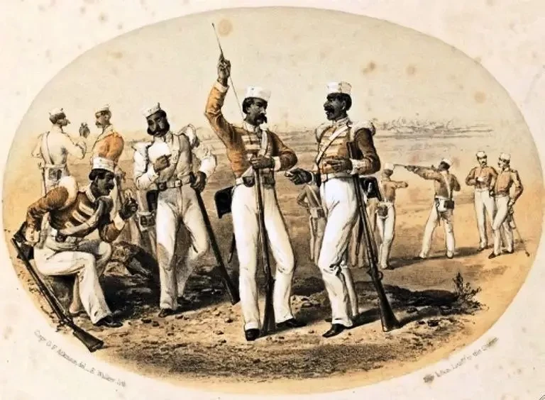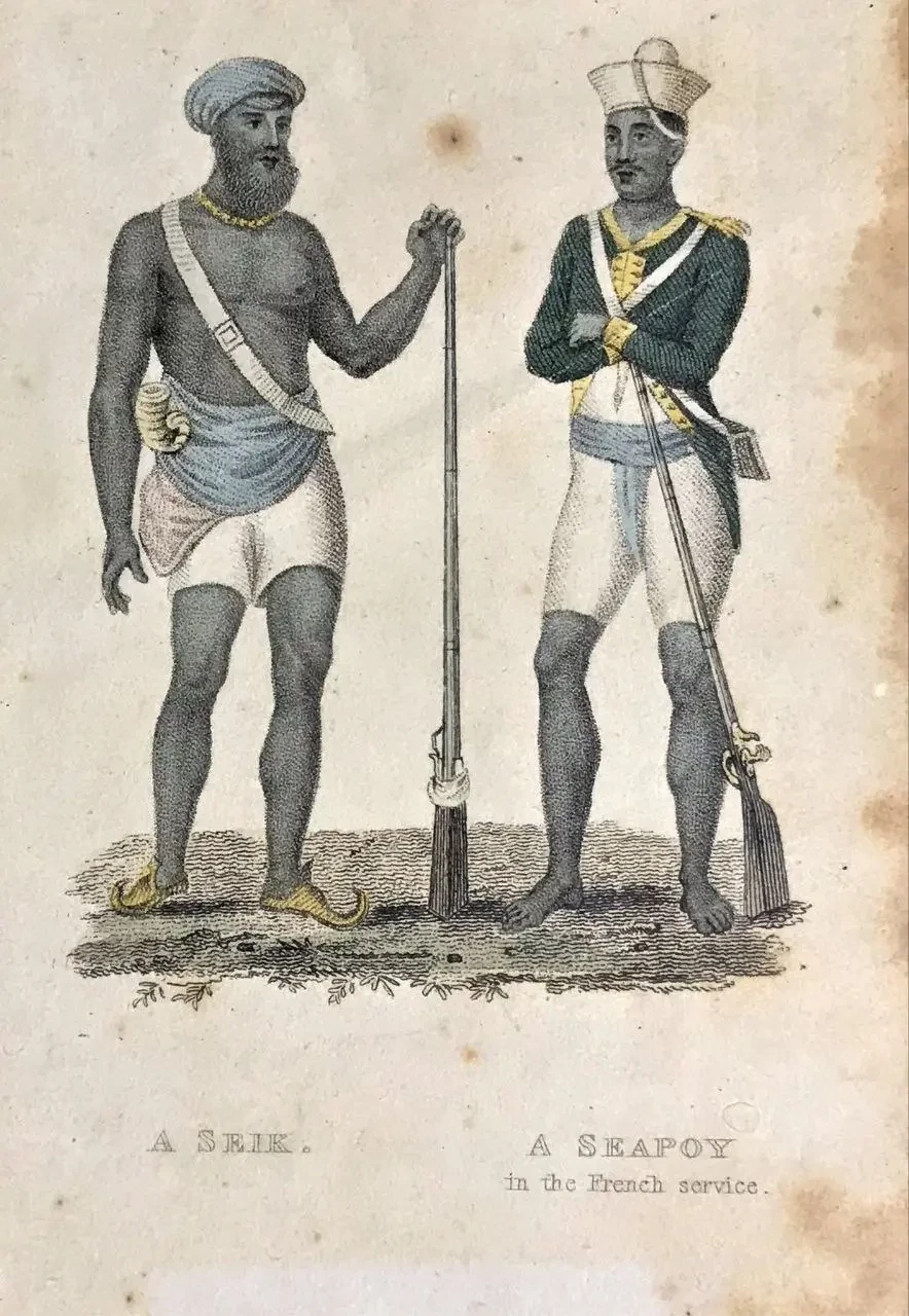 Сипай — исковерканное «сепахи», что на фарси означает «всадник». В армии Великих Моголов сипаями стали называть набранных из индусов или мусульман пехотинцев, вооружённых огнестрельным оружием. Вооружали сипаев тальварами — саблями со своеобразным эфесом, фитильными мушкетами, впоследствии им доверили артиллерию (в том числе пушки на слонах) и ракеты (таки да, в Индии их стали использовать ещё в XVIII веке). Дисциплина... А что это такое? Постепенно отрядами сипаев стали обзаводиться навабы — губернаторы провинций. Но наибольшую известность сипаи приобрели как пехотинцы из местных жителей на службе европейских торговых компаний. Первыми армию из сипаев создали французы, в 1717 году для усиления королевских войск и швейцарских наёмников были наняты первые отряды, опыт был удачным, и к 1720 году французских сипаев было 10 тысяч человек.