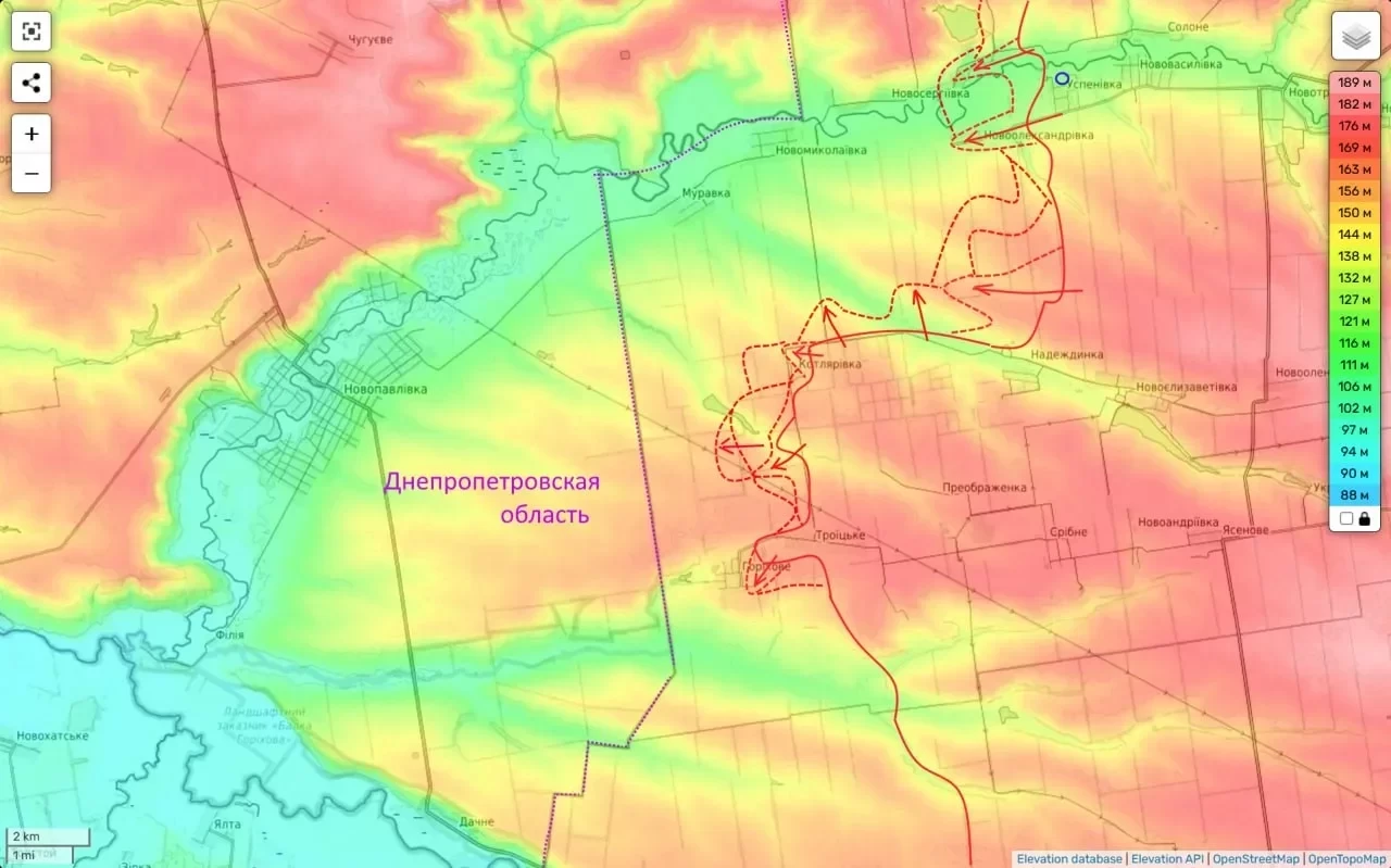 Во-первых, прорыв на Новоеленовку вчера привел не только к полному освобождению это села, но и прорыву линии обороны на западном берегу реки Бычок. Что уже вчера вылилось в наше движение севернее (по линии укрепов, которые мы берем во фланг) и на запад. Где мы заняли еще один большой кусок трассы Покровск-Константиновка и даже перевалили через нее с заходом в тыл гарнизону ВСУ в районе Новой Полтавки (где пока противник оказывает упорное сопротивление).