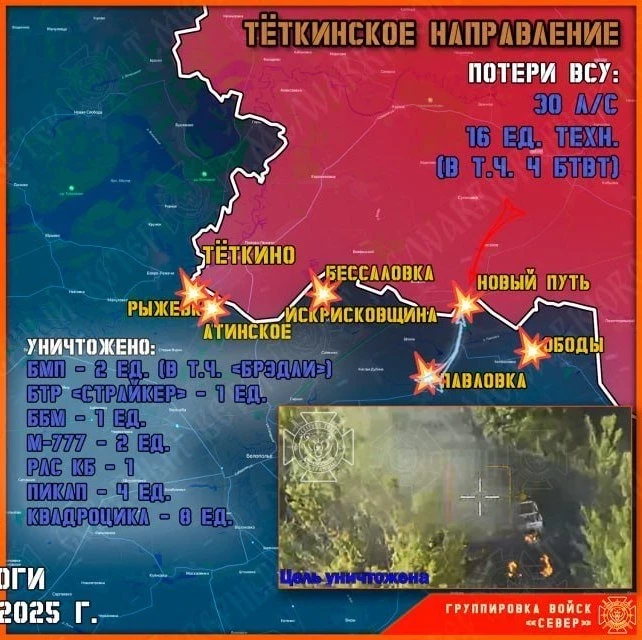 На Курском участке государственной границы вчера в 4 утра колонна вражеской техники из трех БМП, в том числе "Брэдли", и одного БТР "Страйкер" выдвинулась из Павловки (Сумская область) в направлении нашего поселка Новый Путь. Колонна уничтожена на марше.
