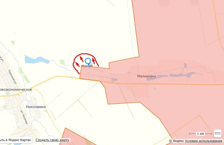 В итоге на актуальной карте можно увидеть, что северо-восточнее Покровска образовалось два выступа, оканчивающиеся сёлами Миролюбовка и Мирное, а между ними получилось что-то наподобие «мешка». С учётом того, что населённых пунктов, где могли бы держать более-менее длительную оборону боевики ВСУ, нет, то можно предположить, что данный «топографический рудимент» скоро нашими военными будет удалён.