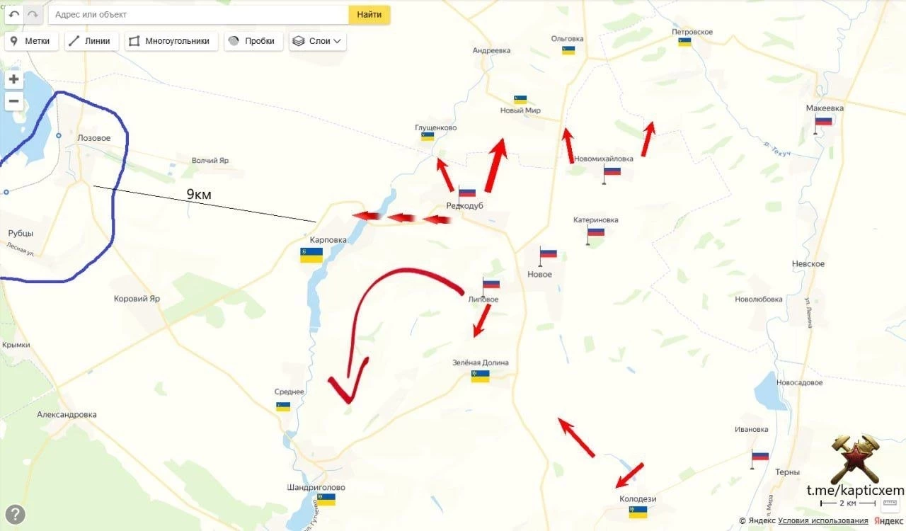 На Изюмском направлении ВС РФ добили все опорники на гребне между Липовое и Колодези, зажали в тиски с юга и севера Зелёную долину и вот вот перережут физически дорогу на Шандриголово, движение по ней и так осложнено из за наших ДРГ и дронов. Идёт заметное продвижение севернее Колодезей.
