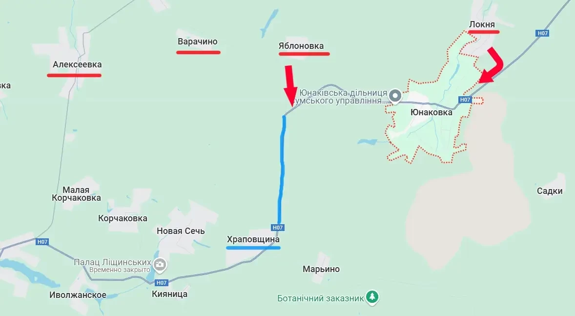 По состоянию на утро 7 июня Вооружённые силы России продолжают продвижение от Яблоновки южнее – в направлении населённого пункта Храповщина. А это говорит о том, что «вертикальный» (на карте) участок дороги Н-07 к северу от Храповщины (помечен синим цветом) в ближайшее время может полностью перейти под физический контроль наших войск.