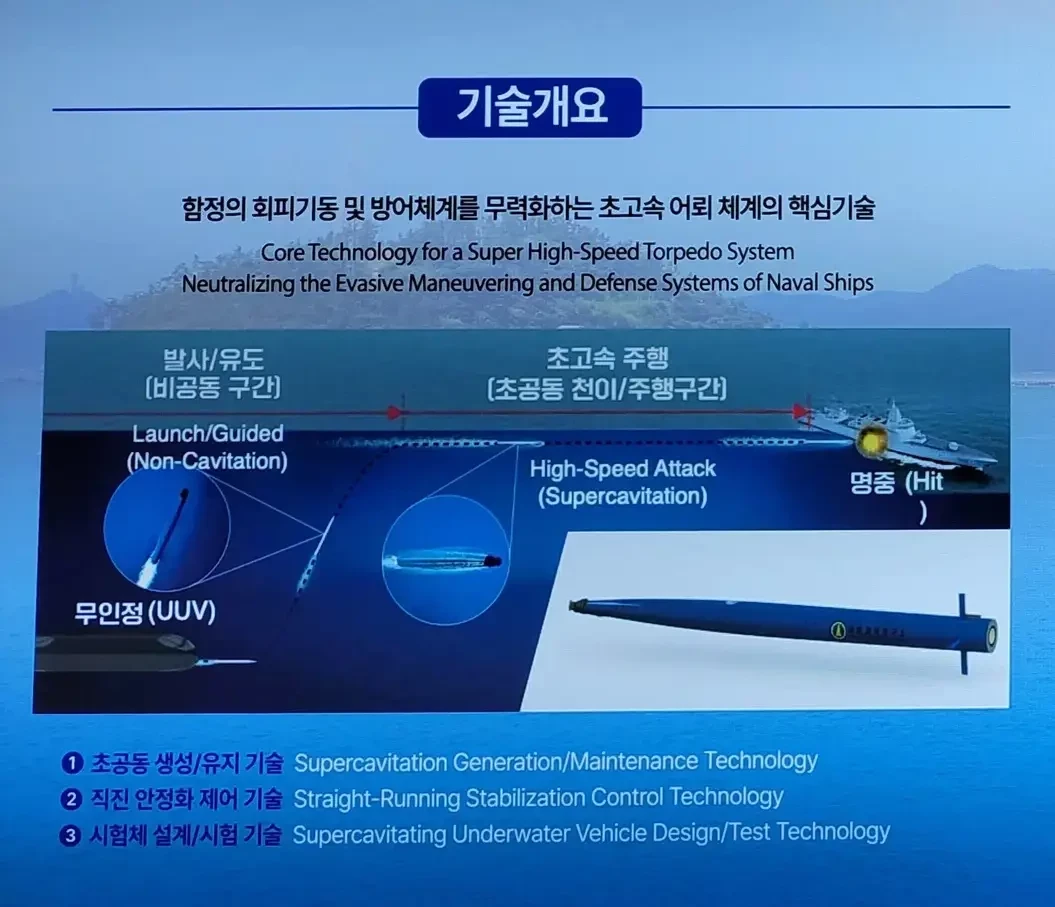 Промышленность Южной Кореи пытается самостоятельно разрабатывать новое вооружение для военно-морских сил и берётся за самые сложные проекты. Например, в течение нескольких последних лет ведется разработка сверхскоростной реактивной торпеды, использующей принцип кавитации. К настоящему времени этот проект дошёл до стадии испытаний. Кроме того, макет новой торпеды впервые показали публике.