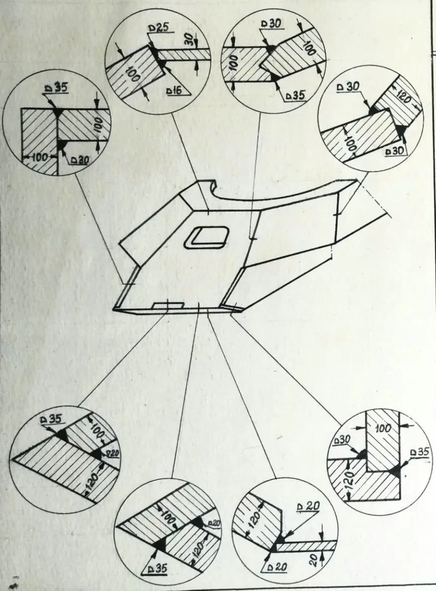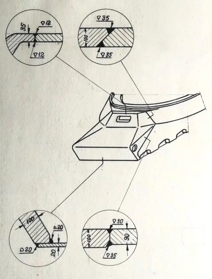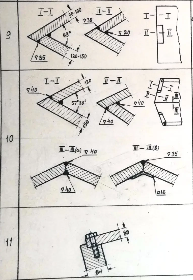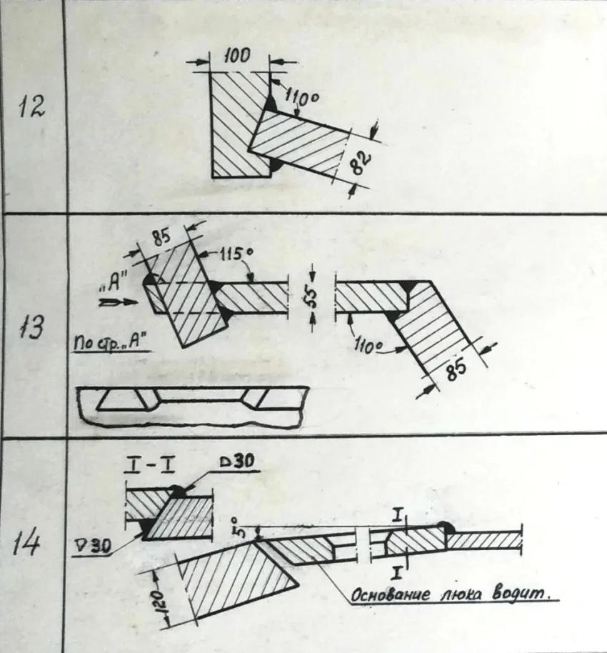 3. Для соединений верхних и нижних лобовых деталей с бортами наилучшую прочность и живучесть показывают выполненные при помощи аустенитовой сварки соединения в четверть, в шип (для брони высокой твердости через угольник), в шип с прорезью, в притык с прорезью и отдельно в притык в случаях, когда деталь имеет опору на другие смежные детали.