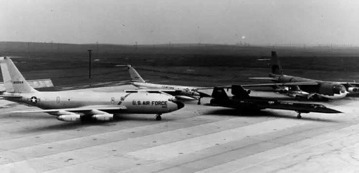 Фото 6. Интересное фото SR-71A 61-7970 на авиабазе «Бил» оба участника инцидента вместе с танкером Boeing KC-135Q, бомбардировщиком Convair B-58 Hustler и бомбардировщиком Boeing B-52, вооруженным ракетами Hound Dog. SR-71A с/н 61-7970 был потерян после столкновения с KC-135Q во время дозаправки.