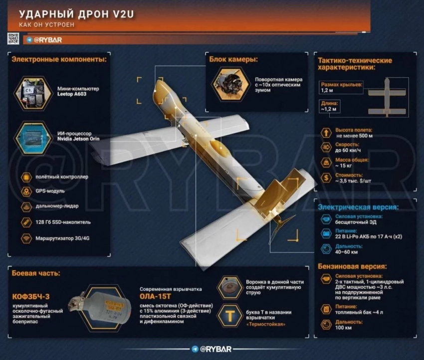 Канал проинформировал о том, что V2U является дроном самолетного типа из пластика массой 15 килограммов. На БПЛА есть поворотная камерой, дальномер, спутниковый навигационный модуль и инерциальная система с геомагнитным датчиком.