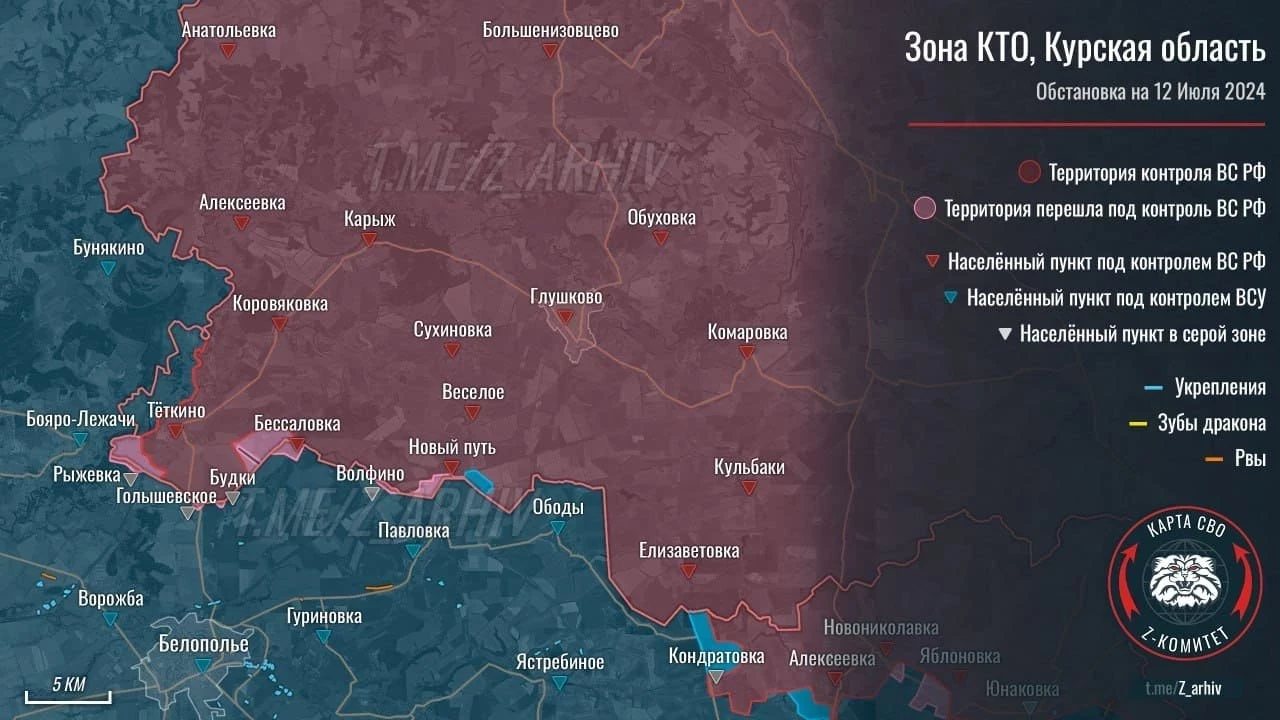 На Сумском направлении идут серьезные бои в районе Кондратовки. ВСУ контратакуют и в некоторых случаях контратакуют успешно. Российские войска продолжают давить на оборону ВСУ в районе Юнаковки. В Курском приграничье без существенных изменений в ЛБС.
