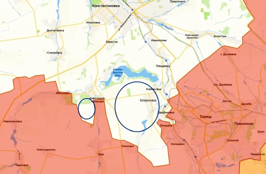 При этом у обороняющегося противника, помимо сужения горлышка отступления на запад и в саму Константиновку, существуют объективные проблемы для этого маневра. Наши уже физически перерезали дорогу на Нелеповку и приближаются к дороге на Плещеевку. Это последние пути отступления гарнизона ВСУ в сторону Константиновки из Клебан-Быкского полукотла и важные дороги организации снабжения. На запад противник двигаться не может — для этого ему необходимо форсировать Клебан-Быкское водохранилище, что, очевидно, сделать весьма непросто.