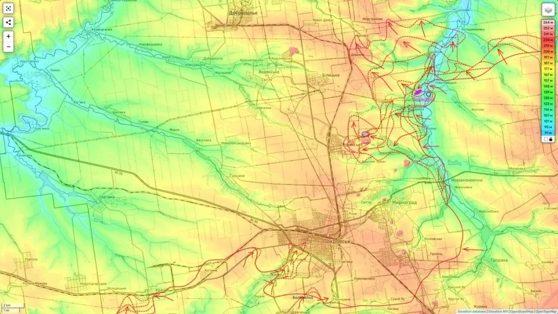 Судя по всему командование ВСУ, понимая катастрофичность положения своей группировки в районе Мирнограда и Покровска перестает обращать внимание на самую дальнюю часть охвата и все силы концентрирует на флангах, чтобы удержать их от распадения.