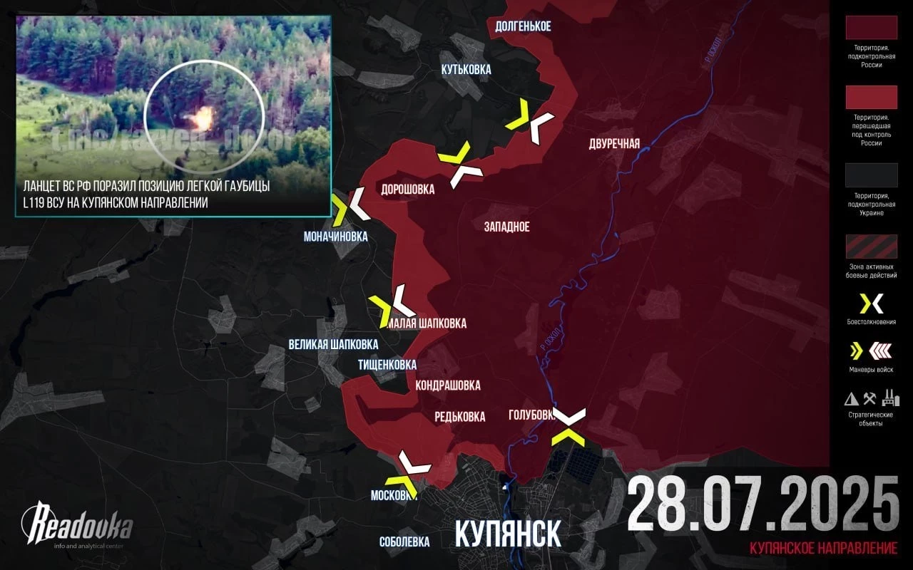 На Купянском направлении тяжёлые бои к северо-западу от Купянска. ВС РФ штурмуют Московку и подходят к Соболевке. ВСУ постоянно контратакуют в районе Кондрашовки и еще держат там ряд позиций. Севернее, со стороны Красного Первого и Каменки, наши штурмовики пробиваются в направлении на Колодезное.