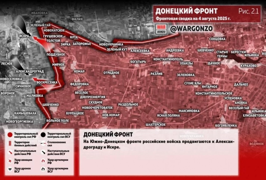 На Южно-Донецком фронте российские войска продвигаются к Александрограду и Искре.