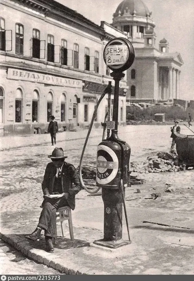 Продавец бензина на улице Белграда. Торговля в Белграде стала первой отраслью экономики, восстановившейся после войны и адаптировавшейся к новым условиям