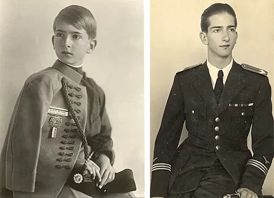 На фото слева: несовершеннолетний Петр II Карагеоргиевич. На фото справа: восемнадцатилетний Петр II Карагеоргиевич. Сын Александра I. В 1934 году наследовал трон при регентстве принца Павла, после убийства в Марселе его отца короля Александра I. В марте 1941 Петр II взял правление в свои руки после революции, начавшейся из-за профашистской ориентации принца-регента Павла. Однако через несколько недель Гитлер завоевал Югославию, и Петр вынужден был искать убежище в Греции, а после прихода к власти маршала Тито он находился в эмиграции в Англии и Франции