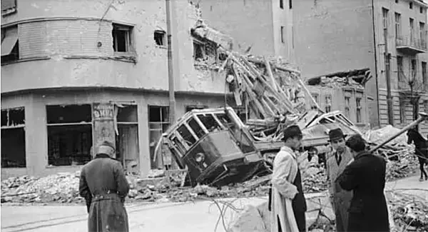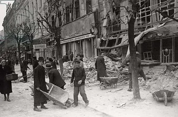Белград после бомбардировки. Около 7:00 первые волны немецких бомбардировщиков пролетели над Белградом и сбросили свой смертоносный груз. Серьезной обороны практически не было – некоторое время велась слабая зенитная стрельба, несколько югославских истребителей поднялись в воздух и вступили в воздушные бои, но были выведены из строя в самые кратчайшие сроки. Весь город был легкой добычей немецких бомбардировщиков. Источник: Белградская национальная библиотека