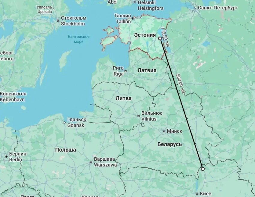 Но есть в этой истории и другой нюанс. Состоит он в том, а летел ли этот дрон с территории Украины или же и запускался он с ведома той же Эстонии из позиционного района, находящегося в этой стране НАТО? Ведь от севера Украины до места падения беспилотника порядка 800 км. И это по прямой. Если допустить, что украинский дрон летел через российское воздушное пространство, то ему до Эстонии пришлось бы преодолеть более 900 км. Либо же пришлось бы лететь через Белоруссию, Литву и Латвию (или Белоруссию и Псковскую область РФ).