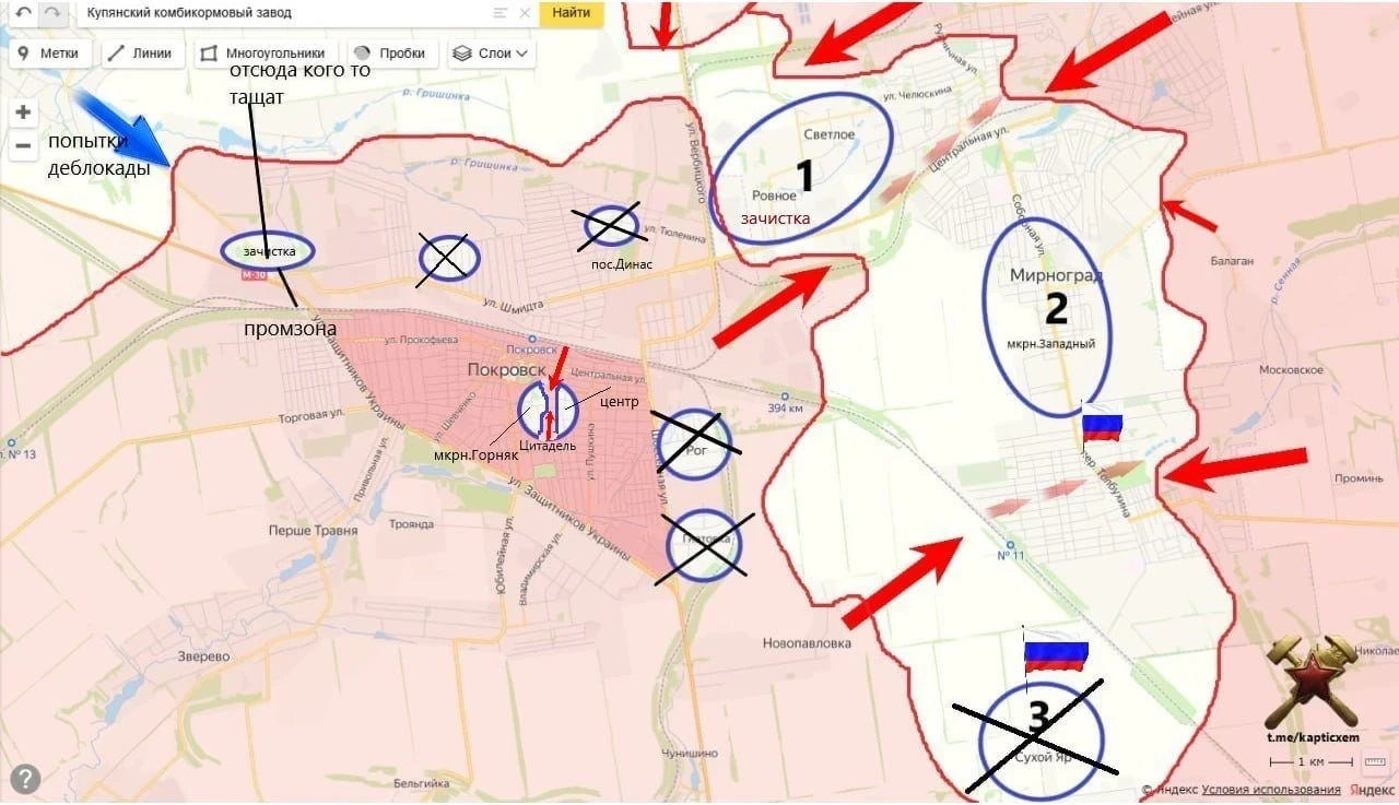 Противник вынужден прзнать, что в северо-западной части города наши войска закрепились и продолжают штурмовать со стороны Покровска и вдоль железной дороги уже в направлении Гришино, где противник хотел выстроить новую линию обороны. В Мирнограде (Димитрове) по ВСУ наши бьют ФАБ-3000.