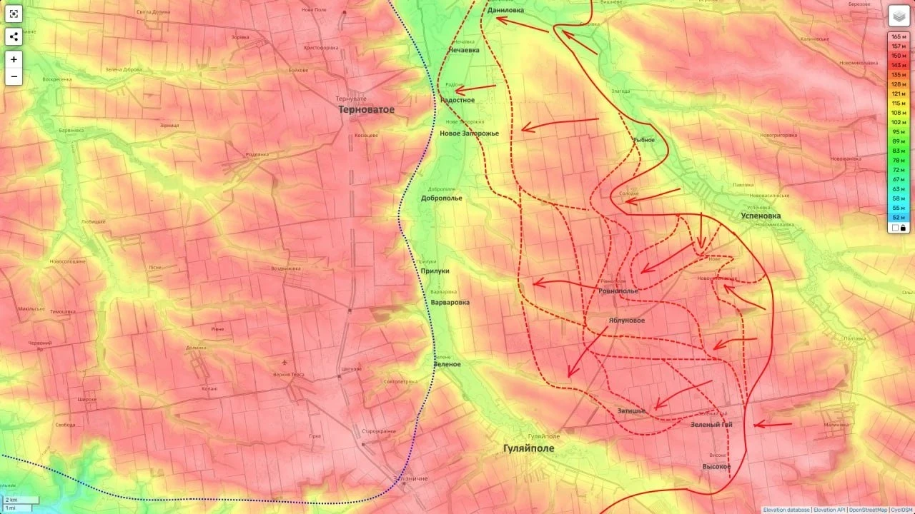 Таким образом наши части группировки «Восток» широким фронтом и по меркам СВО очень быстро выходят на окраины Гуляйполя (около 1,5 км с северо-востока) и на линию обороны ВСУ по реке Ганчур.