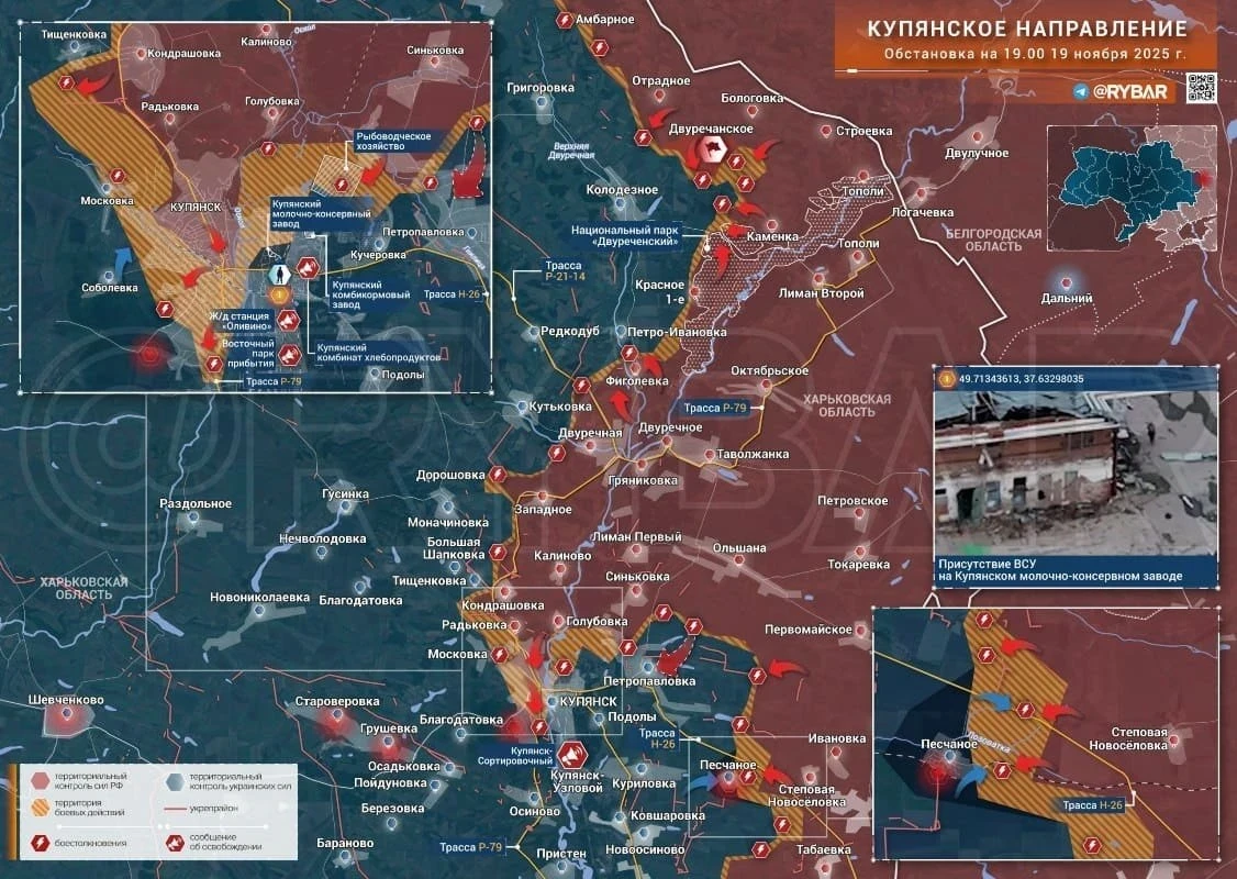 На Купянском направлении ВСУ предпринимает очень мощные контратаки по всему западному периметру города, от Голубовки и Радьковки до Благодатовки и Осиново. Восточнее города интенсивные бои идут в районе Степовой Новосёловки и Песчаного. Тяжёлое противостояние в районе Куриловки и Купянска-Узлового, где у ВСУ частично сохраняются переправы через Оскол.