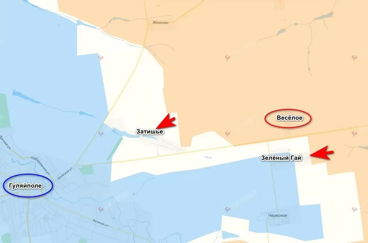 Село Затишье, расположенное менее чем в двух километрах к северо-востоку от Гуляйполя, фактически перешло под контроль подразделений 5-й Армии (5А) ВС РФ.