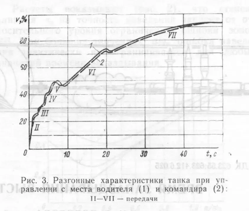 При оценке каждого упражнения сравнивались качества управления с места командира и места водителя машины. Разгонные характеристики (рис. 3), полученные на горизонтальной участке трассы, показали, что время разгона в обоих случаях почти одинаково.