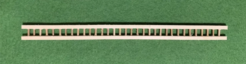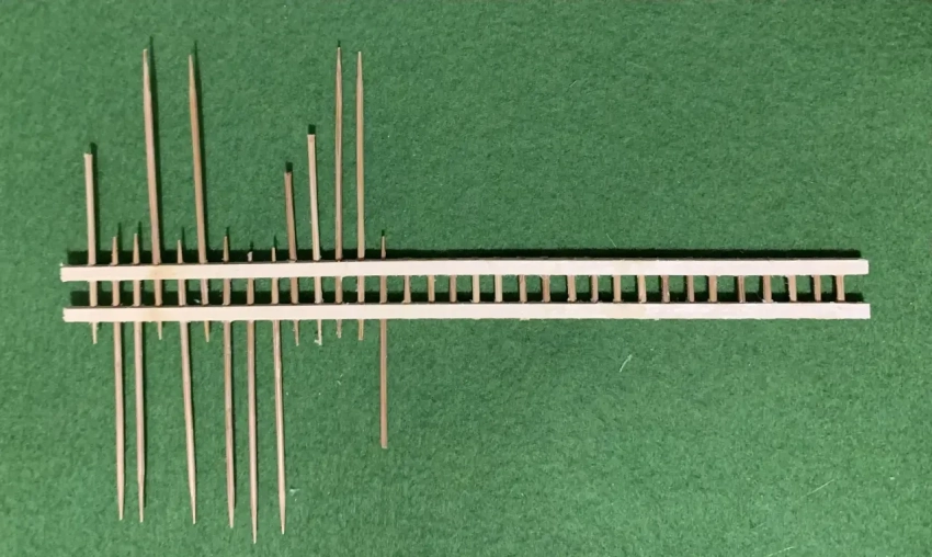 Наиболее трудоемкая деталь башни – лестница, что ведет на ее верхнюю площадку. Для ее изготовления потребуются две рейки квадратного сечения от компании «АВ-модель», в которых с шагом 5 мм просверливаются отверстия диаметром 1 мм. В масштабе 1:72, в котором как раз и делается наша модель башни, высота лестницы составит 170 мм. В отверстия вставляются зубочистки, смазанные клеем.