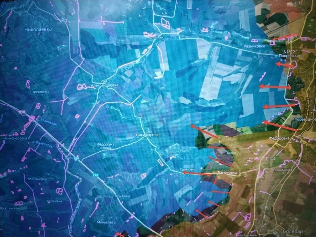 Встречные бои развернулись в центре Гуляйполя, ВСУ пока удерживают позиции в западной части города. Вдоль западного берега р. Гайчур ВС РФ пробиваются южнее Терноватого. Враг не менее 8 раз контратаковал на этом участке. МО РФ сообщило об освобождении Андреевки, после чего ВС РФ начали пробиваться к Братскому с юга и востока. Село важно для дальнейшего освобождения Терноватого и продвижения на запад в сторону Орехова и Запорожья.