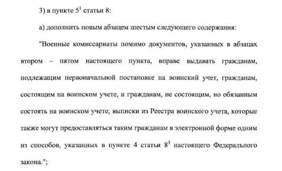 Военные комиссариаты могут выдавать выписки из Реестра воинского учёта в электронном виде. Фото: Выдержка из федерального закона от 04.11.2025 № 412-ФЗ
