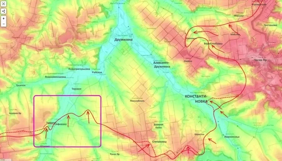Одновременно развивается наступление вдоль реки Казённый Торец. Занята Софиевка севернее Шахово, подразделения продвигаются к Новониколаевке и Новогригорьевке. Задача на этом участке - охват Константиновки с юго-запада и запада с перспективой выхода к Дружковке совместно с силами группировки "Юг".