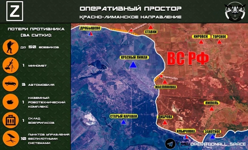 С Краснолиманского направления сообщают о достаточно мощном продвижении ВС РФ в районе Святогорска. Наши войска закрепляются в Александровке и Сосновом, а также заходят на окраины Святогорска. Противник признаёт присутствие наших войск в районе Пришиба. На восточных окраинах Красного Лимана идут позиционные бои.