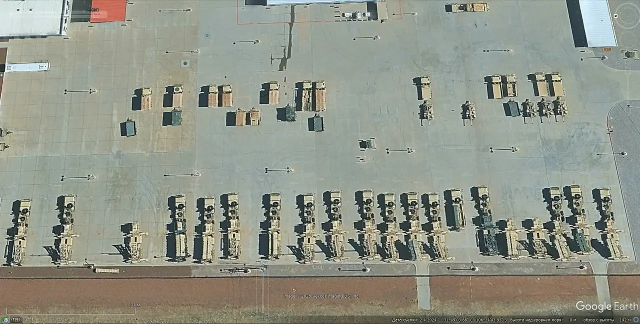 Спутниковый снимок Google Earth: элементы ЗРК Patriot хранящиеся на военной базе Форт-Блисс. Снимок сделан в феврале 2024 года