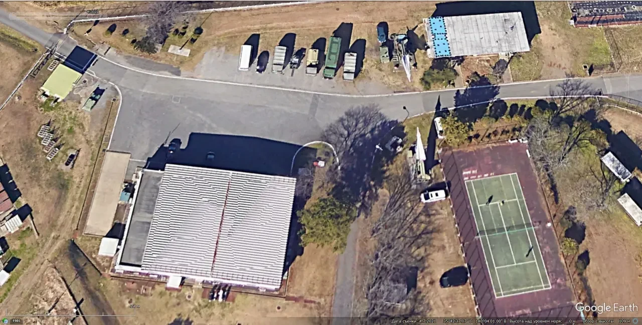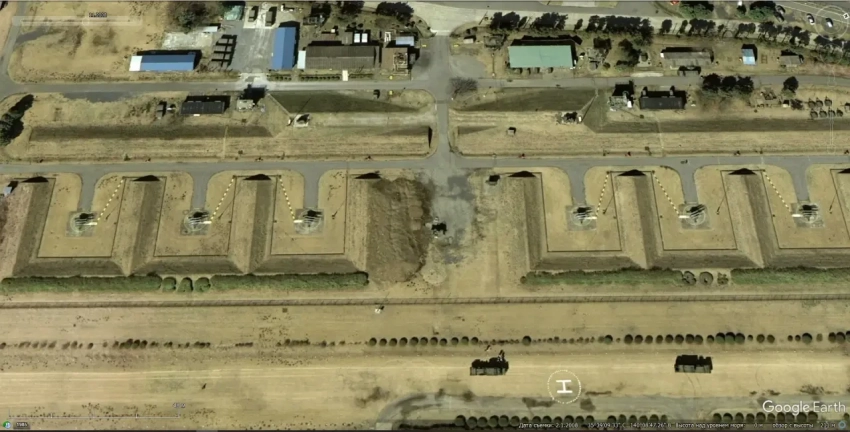Спутниковый снимок Google Earth: позиция ЗРК Hawk Type III на военной базе Симошизу в Токио. Снимок сделан в феврале 2008 года